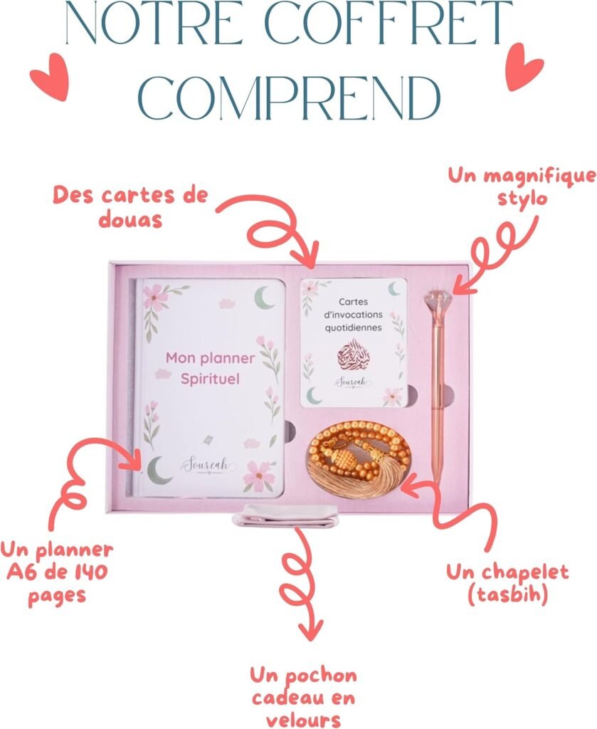 Le coffret comprend un planner musulman, des cartes de douas soigneusement sélectionnées, un tasbih élégant, un stylo assorti ainsi qu’une pochette au design floral rose et bordeaux.